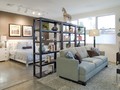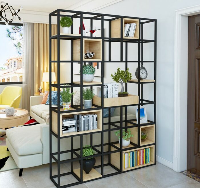 Стеллаж-перегородка в стиле лофт состоит из стального каркаса с множеством полок, а также ниш разного размера и формы. Он может быть любого размера и высоты, хоть до потолка. Классическое сочетание черного металла и светлого дерева смотрятся стильно.